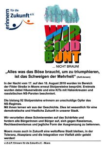In der Nacht vom 17. auf den 18. August 2018 wurden im Bereich der Filder Straße in Moers erneut Stolpersteine besprüht. Erstmals wurden dabei Häuserwände und eine KiTa mit Hakenkreuzen und rassistischen NS-Parolen beschmiert. Die bislang 92 Stolpersteine erinnern an unschuldige Opfer des NS-Regimes. Mit ihnen lernen wir aus der Geschichte. Dies ist wesentlich für eine demokratische und friedliche Zukunft in unserer Stadt.