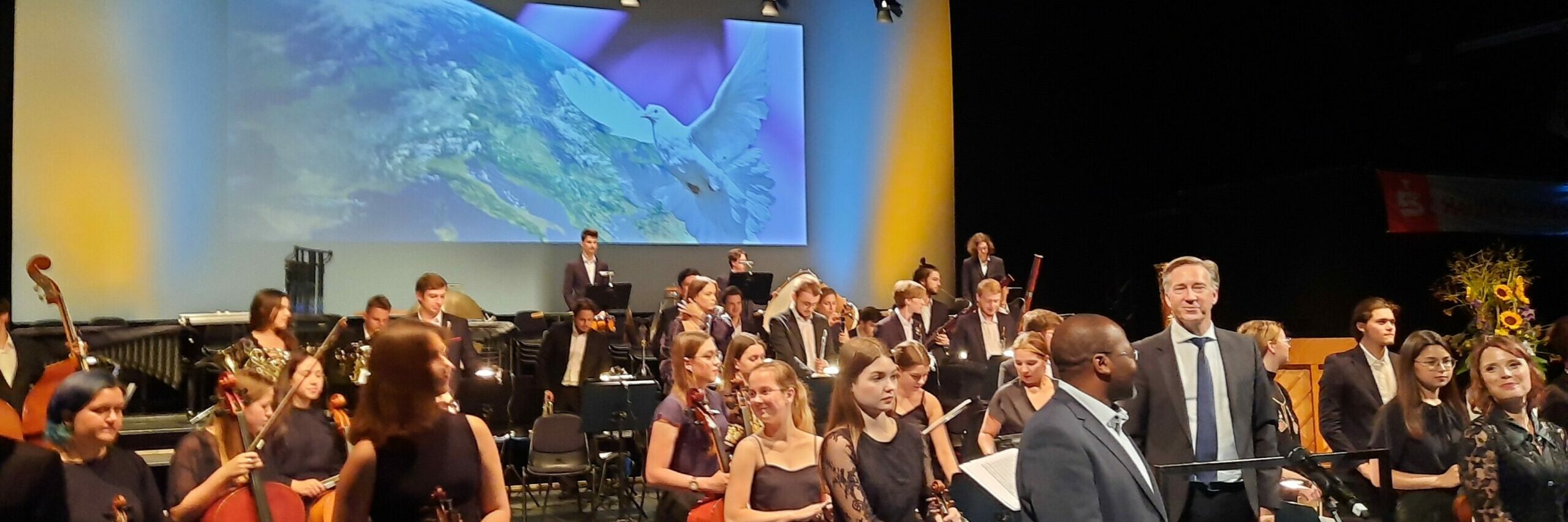 Mit einem emotionalen „Konzert für den Frieden“ am Mittwoch, 31.08.22, am Mittag in der voll besetzten Enni-Eventhalle hat sich das Jugendsinfonieorchester der Ukraine (YSOU) aus Moers verabschiedet. Auf dem Programm standen bekannte Friedenslieder wie „Sag mir, wo die Blumen sind“, „We shall overcome“, aber auch Stücke wie das eindrucksvolle Klagelied „Wie liegt die Stadt so wüst“, Brechts „Bitten der Kinder“ oder die „Ode an die Freude“ („Alle Menschen werden Brüder“) von Ludwig van Beethoven.