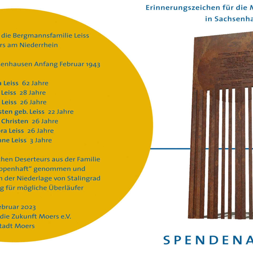 DetailsStudienfahrt zur Gedenkstätte Sachsenhausen: 3. bis 5.2.2023 Am 4. Februar 1943 wurde die Familie Leiss aus der Moerser Ruhrstraße im KZ Sachsenhausen in sog. Sippenhaft brutal…